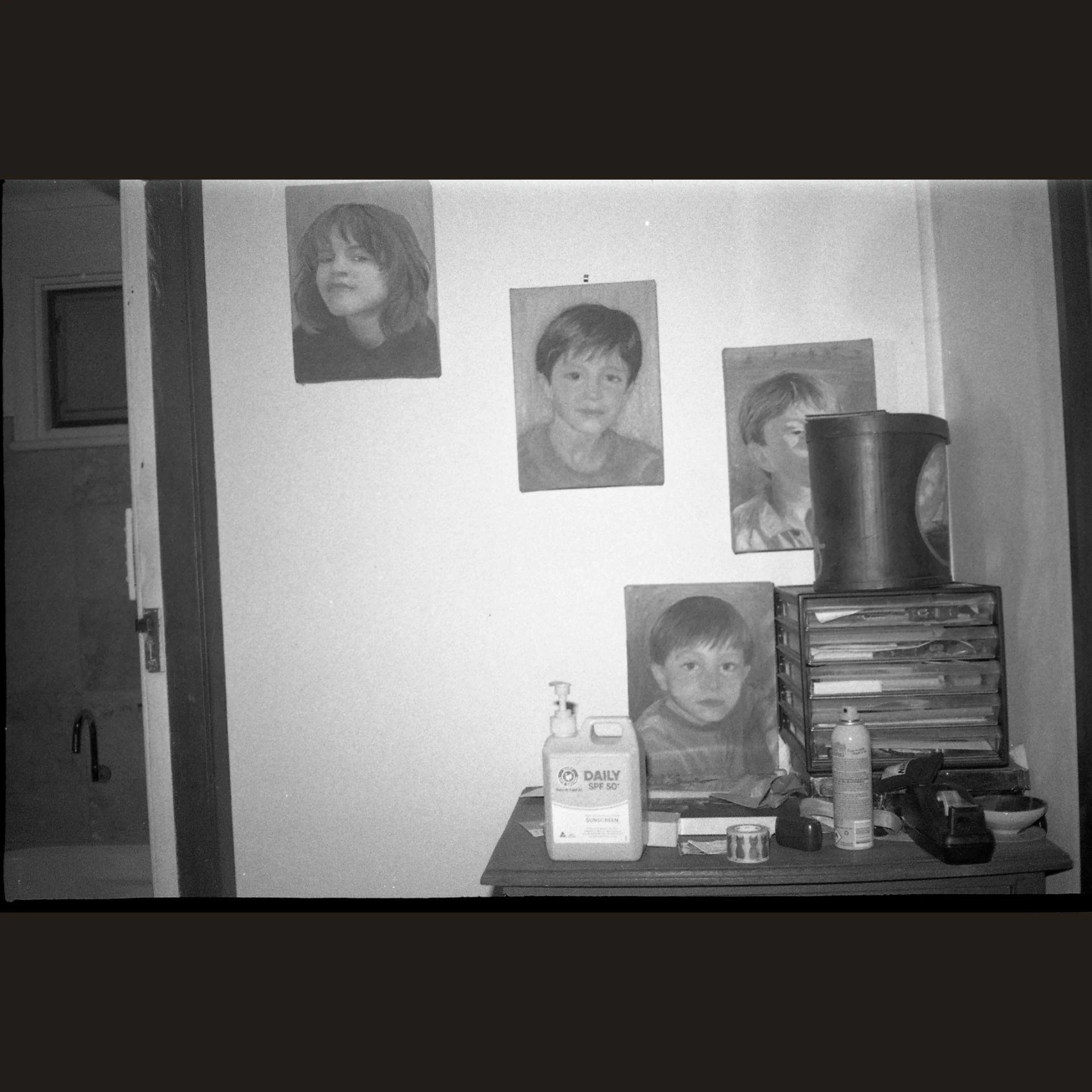 Paintings my mum did of my brothers and I. They hang outside the bathroom. I was born in the bath you can see there on the left. "They're amazing, mum." we'd tell her. "They're not great," she said.